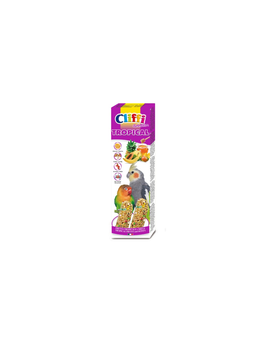 Gli STICKS sono importanti per i parrocchetti da compagnia, perché oltre a fornire le sostanze nutritive utili per una corretta alimentazione, lo inducono ad alimentarsi, staccando i semi, come in natura, consentendogli di attuare tutti quei comportamenti che sono importanti per il mantenimento di un buon equilibrio psico-fisico. Gli sticks CLIFFI “TROPICAL” con FRUTTA TROPICALE e MIELE forniscono al parrocchetto un ottimale apporto di tutte le importanti sostanze contenute nella frutta e nel miele come zuccheri e sali minerali indispensabili per mantenerlo in buona salute e per suo il benessere.