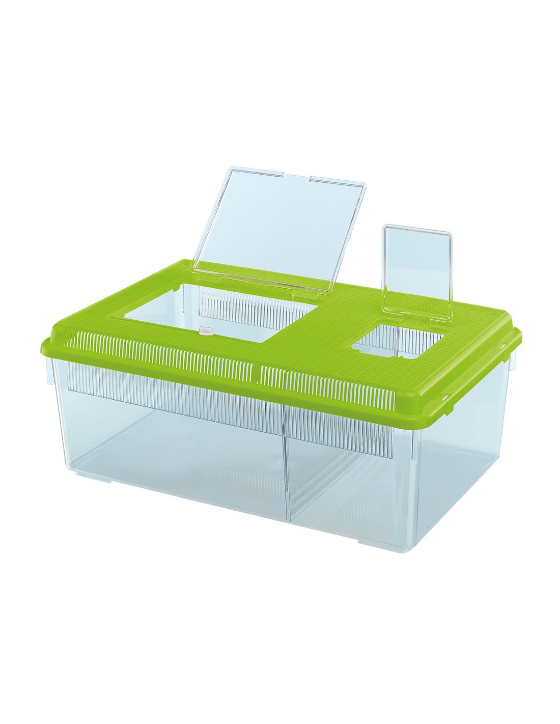 Geo Flat Large è un contenitore in plastica completo di coperchio removibile con sportellini apribili per consentire una facile manutenzione. La vasca ha una capacità di 8 litri e si caratterizza per due ambienti separati comunicanti. Ideale per ospitare i pesci per breve tempo, quando dovete ad esempio fare manutenzione all'acquario, ha sulla parte superiore utili fessure per il passaggio dell'aria.